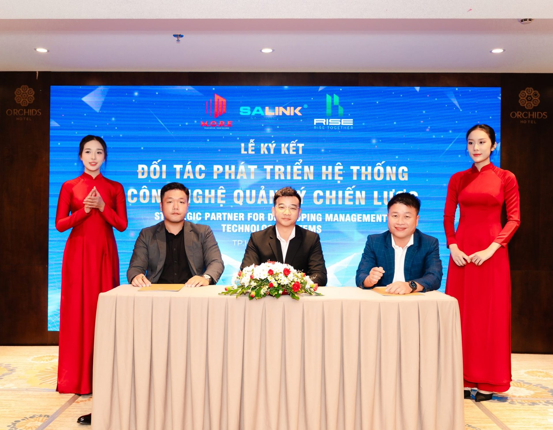 Ông Âu Lê Tú – Giám đốc điều hành MORE Việt Nam (bên trái), Ông Lê Tấn Huy – Giám đốc điều hành SALINK Việt Nam (giữa), Ông Huỳnh Trương Thi – Giám đốc điều hành RISE Việt Nam (bên phải) – Tại buổi Lễ ký kết hợp tác