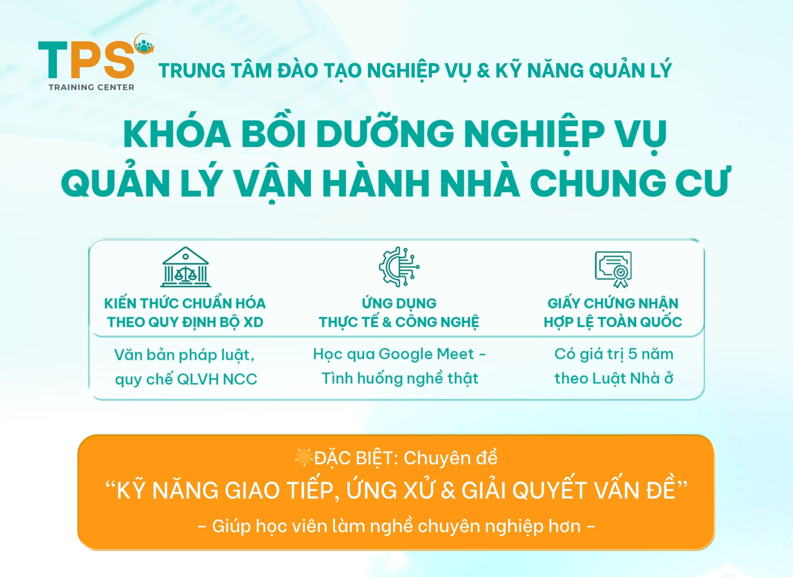 Khóa học “Bồi dưỡng nghiệp vụ Quản lý vận hành nhà chung cư” do Trung tâm Đào tạo TPS tổ chức dự kiến khai giảng vào Tháng 11/2025. Khóa học diễn ra trong khung giờ 18h30 – 20h30 Thứ 3, 5, 7 hằng tuần, với đội ngũ giảng viên là các chuyên gia đầu ngành với nhiều năm kinh nghiệm thực tiễn. Chương trình được thiết kế phù hợp cho doanh nghiệp, tổ chức, thành viên Ban Quản trị, cá nhân đang công tác trong lĩnh vực quản lý vận hành hoặc có nhu cầu trang bị kiến thức pháp lý – kỹ năng nghiệp vụ.