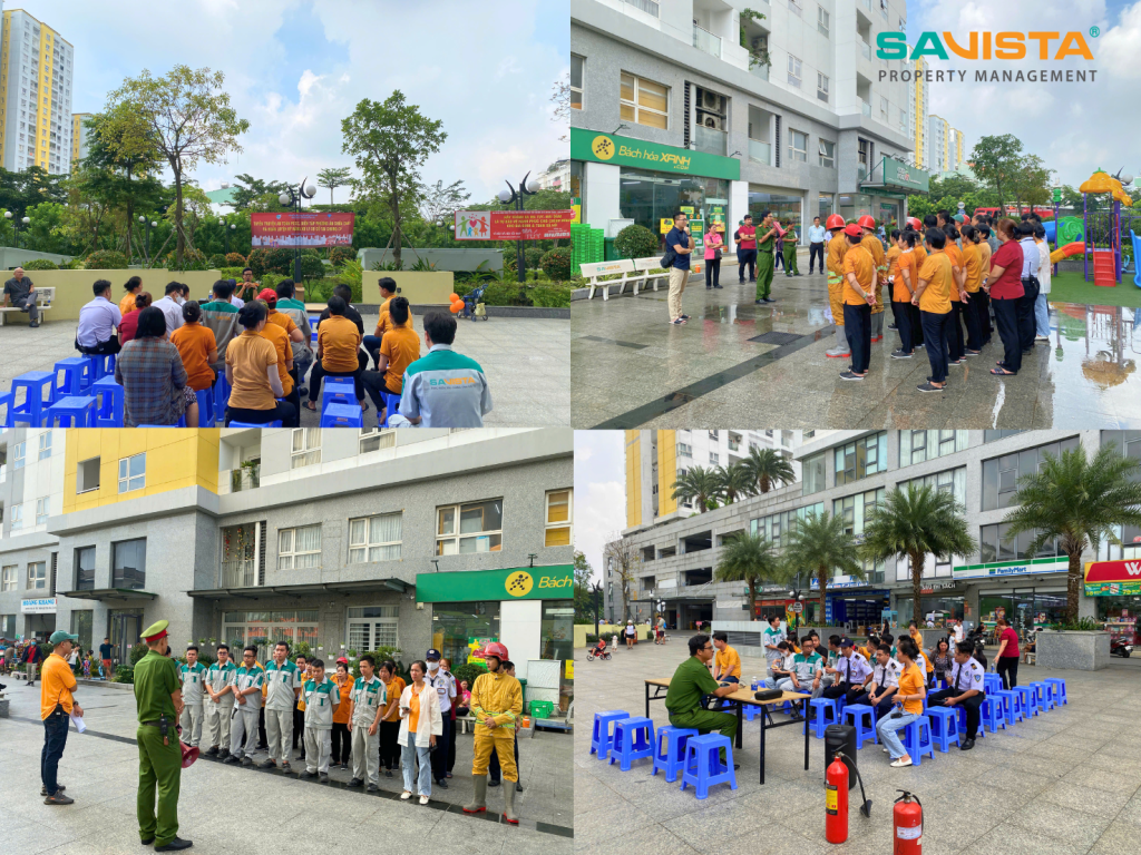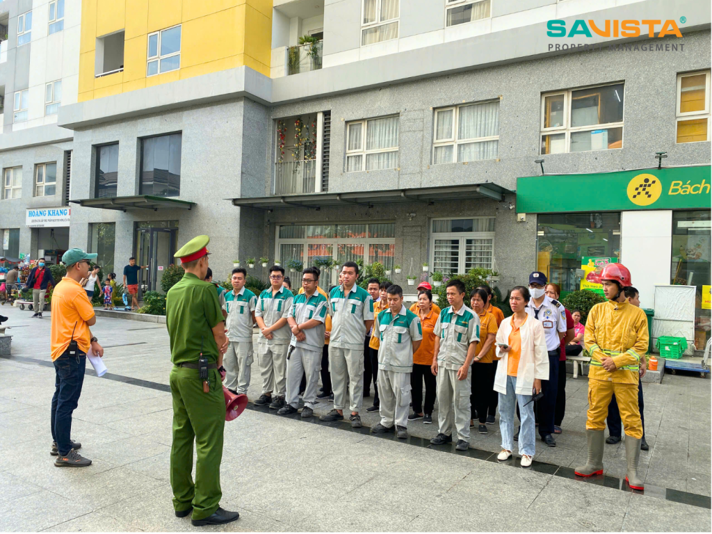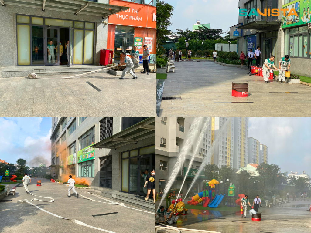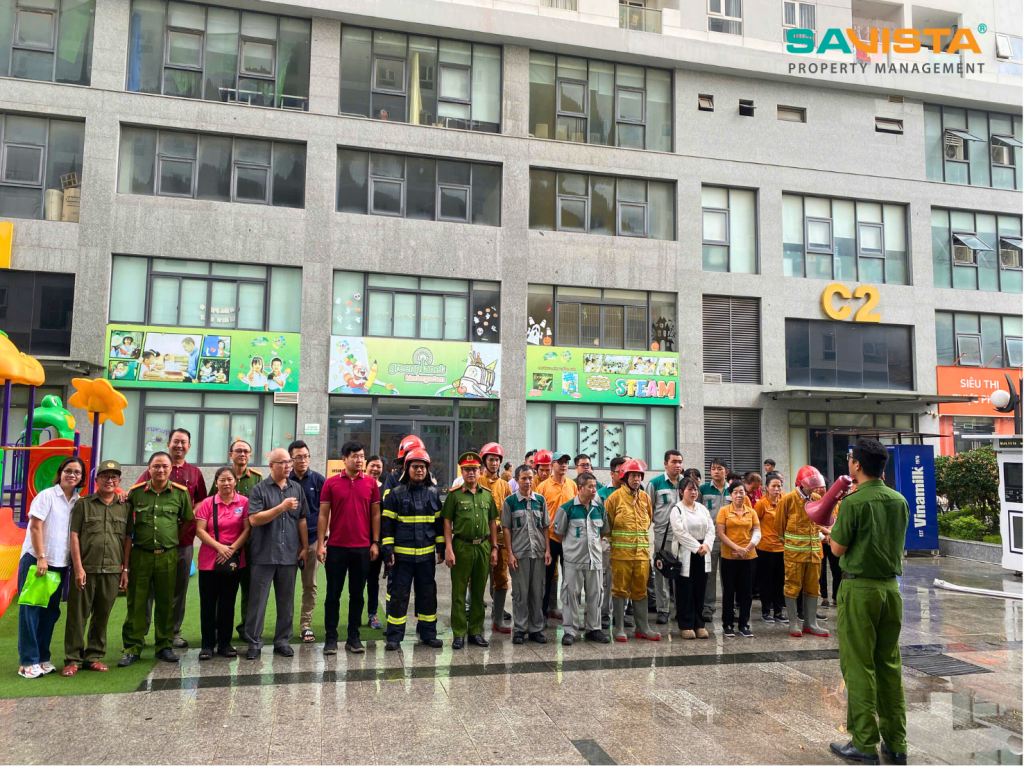 Buổi diễn tập được tiến hành nghiêm túc, có sự tham gia của đội kỹ thuật SAVISTA, nhân viên an ninh, bộ phận vệ sinh và lực lượng PCCC cơ sở. Các đội ngũ nhân sự được hướng dẫn quy trình thao tác sử dụng bình chữa cháy, sơ tán cư dân theo lộ trình an toàn, kiểm soát khu vực nguy hiểm và phối hợp xử lý tình huống giả định dưới sự hướng dẫn trực tiếp của Cảnh sát PCCC.
